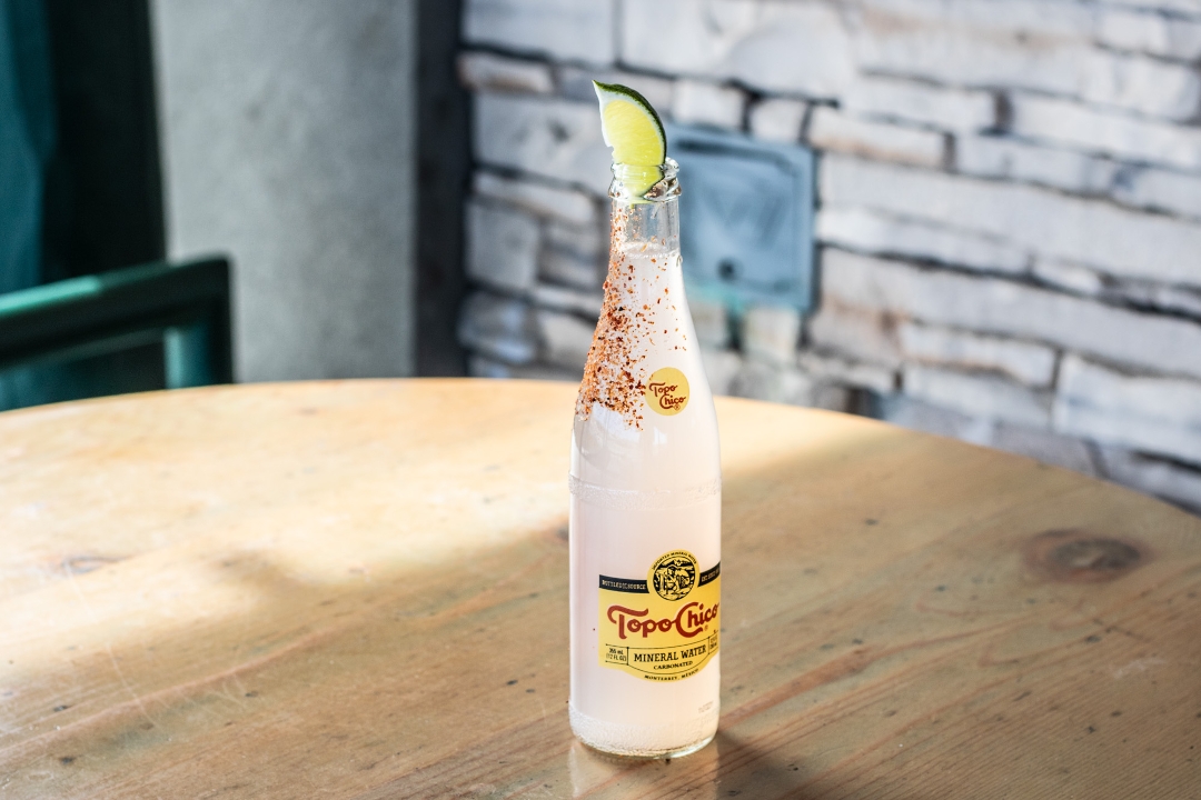 Deep Eddy Ruby Red vodka and lime juice mixed in a topo chico bottle dressed with tajin